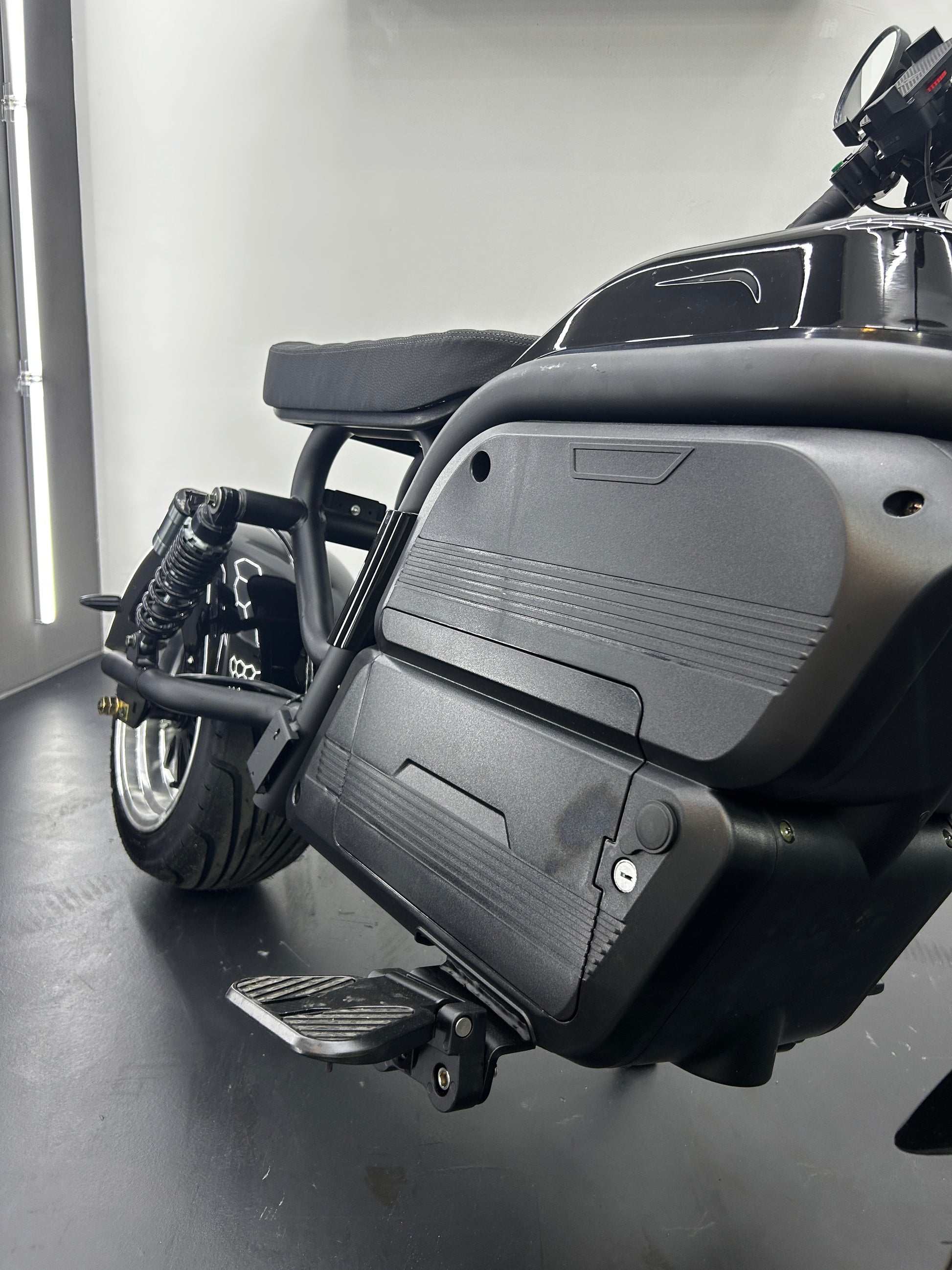 The electric motor has sustained power, large stall torque and reliable operation. Immediate acceleration thanks to the electric wheel hub motor up to 45 km/h and 20° incline, the e-chopper travels with ease. Reach a range of up to 70-110km with a top speed of up to 45km/h on a single charge.